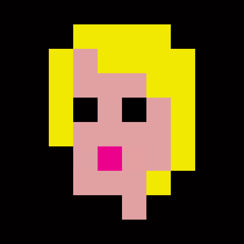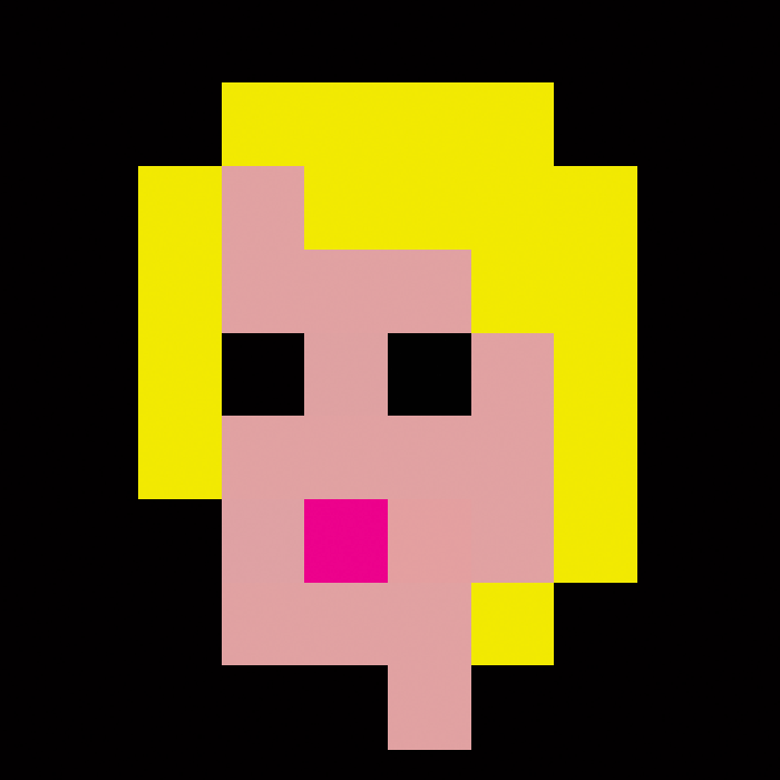 The background is a solid black. The face has 5 traits using the color rose. The pink mouth has 5 traits. The top layer has 20 different hair styles kept in yellow.